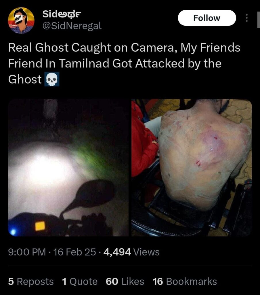 ಆದರೆ ಈ ವೈರಲ್ ಪೋಸ್ಟ್ಗಳ ಮೂಲವನ್ನು ಪರಿಶೀಲಿಸಿದಾಗ, ಇದೇ ಫೋಟೋ ಮತ್ತು ವಿಷಯವು 2025 ಫೆಬ್ರವರಿ 16ರಂದು ಸಾಮಾಜಿಕ ಜಾಲತಾಣದಲ್ಲಿ ಈಗಾಗಲೇ ಅಪ್ಲೋಡ್ ಆಗಿದ್ದದ್ದು ಕಂಡುಬಂದಿದೆ. “ತಮಿಳುನಾಡಿನಲ್ಲಿ ನನ್ನ ಸ್ನೇಹಿತನ ಮೇಲೆ ಭೂತ ದಾಳಿ” ಎಂಬ ಹೇಳಿಕೆಯಲ್ಲಿ ಈ ಚಿತ್ರಗಳನ್ನು ಹಂಚಲಾಗಿದ್ದು, ಇದೀಗ ಅದನ್ನೇ ಮಂಗಳೂರು ಮಂಜಲ್ಪಾದೆ ಘಟನೆಯಂತೆ ಮತ್ತೆ ಹರಡಲಾಗುತ್ತಿದೆ ಎಂಬ ಅನುಮಾನ ವ್ಯಕ್ತವಾಗಿದೆ.