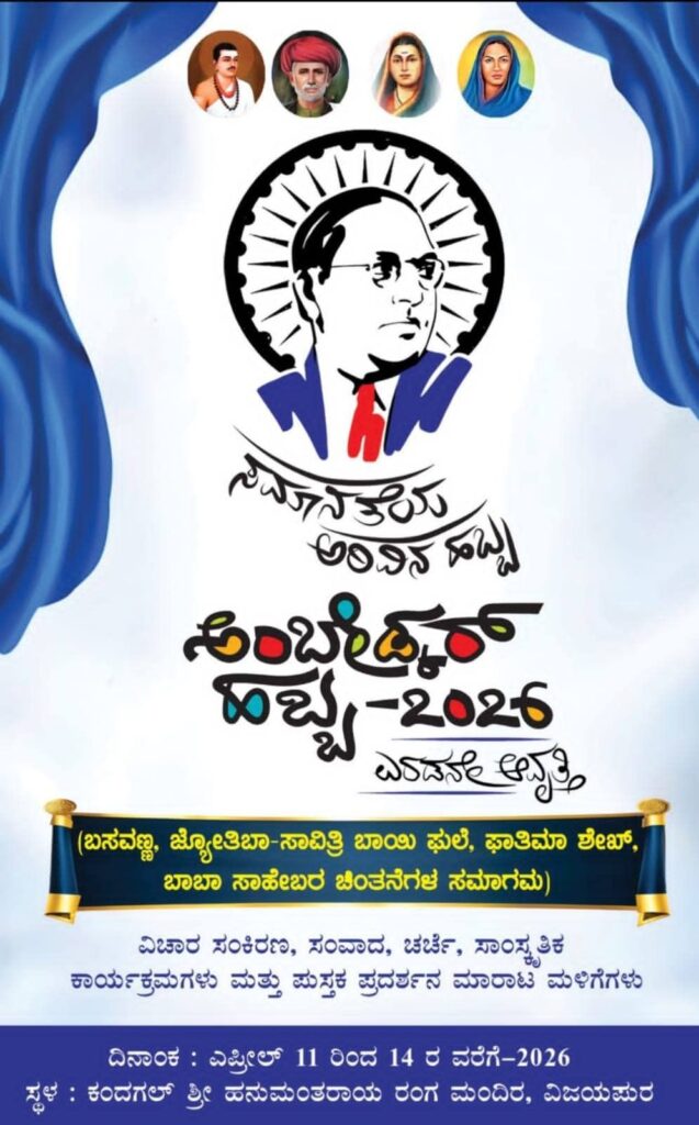 ವಿಜಯಪುರ: ಸಂವಿಧಾನದ ಮೌಲ್ಯಗಳು, ಸಾಮಾಜಿಕ ನ್ಯಾಯ ಮತ್ತು ಸಮಾನತೆಯ ಸಂದೇಶವನ್ನು ಸಮಾಜದ ಎಲ್ಲ ವರ್ಗಗಳಿಗೂ ತಲುಪಿಸುವ ಉದ್ದೇಶದಿಂದ ವಿಜಯಪುರದಲ್ಲಿ “ಸಂವಿಧಾನ ಹಬ್ಬ–2026” ಕಾರ್ಯಕ್ರಮವನ್ನು ಆಯೋಜಿಸಲಾಗಿದೆ. ಬಸವಣ್ಣ, ಜ್ಯೋತಿಬಾ–ಸಾವಿತ್ರಿಬಾಯಿ ಫುಲೆ, ಫಾತಿಮಾ ಶೇಖ್ ಹಾಗೂ ಬಾಬಾ ಸಾಹೇಬ ಡಾ. ಬಿ.ಆರ್. ಅಂಬೇಡ್ಕರ್ ಅವರ ಚಿಂತನೆಗಳನ್ನು ಜನರಿಗೆ ಪರಿಚಯಿಸುವುದು ಈ ಕಾರ್ಯಕ್ರಮದ ಮುಖ್ಯ ಉದ್ದೇಶವಾಗಿದೆ.
