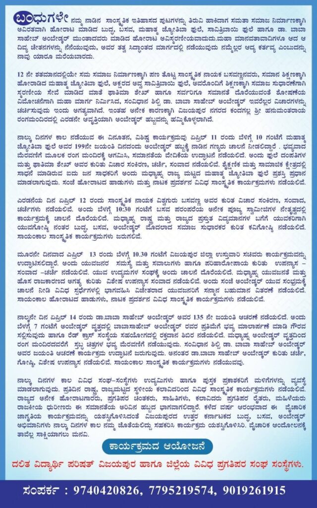 ಏಪ್ರಿಲ್ 11 ರಿಂದ 14ರವರೆಗೆ ವಿಜಯಪುರ ನಗರದ ಕಂದಗಲ್ನ ಶ್ರೀ ಹನುಮಂತಾಯ ರಂಗಮಂದಿರದಲ್ಲಿ ಈ ನಾಲ್ಕು ದಿನಗಳ ಸಂವಿಧಾನ ಹಬ್ಬ ನಡೆಯಲಿದೆ. ಈ ಅವಧಿಯಲ್ಲಿ ವಿದ್ಯಾರ್ಥಿಗಳು, ಯುವಕರು ಮತ್ತು ಸಾರ್ವಜನಿಕರಿಗಾಗಿ ವಿಶೇಷ ಕಾರ್ಯಕ್ರಮಗಳು, ಚರ್ಚೆಗಳು ಹಾಗೂ ಸಾಂಸ್ಕೃತಿಕ ಕಾರ್ಯಕ್ರಮಗಳನ್ನು ಆಯೋಜಿಸಲಾಗಿದೆ.